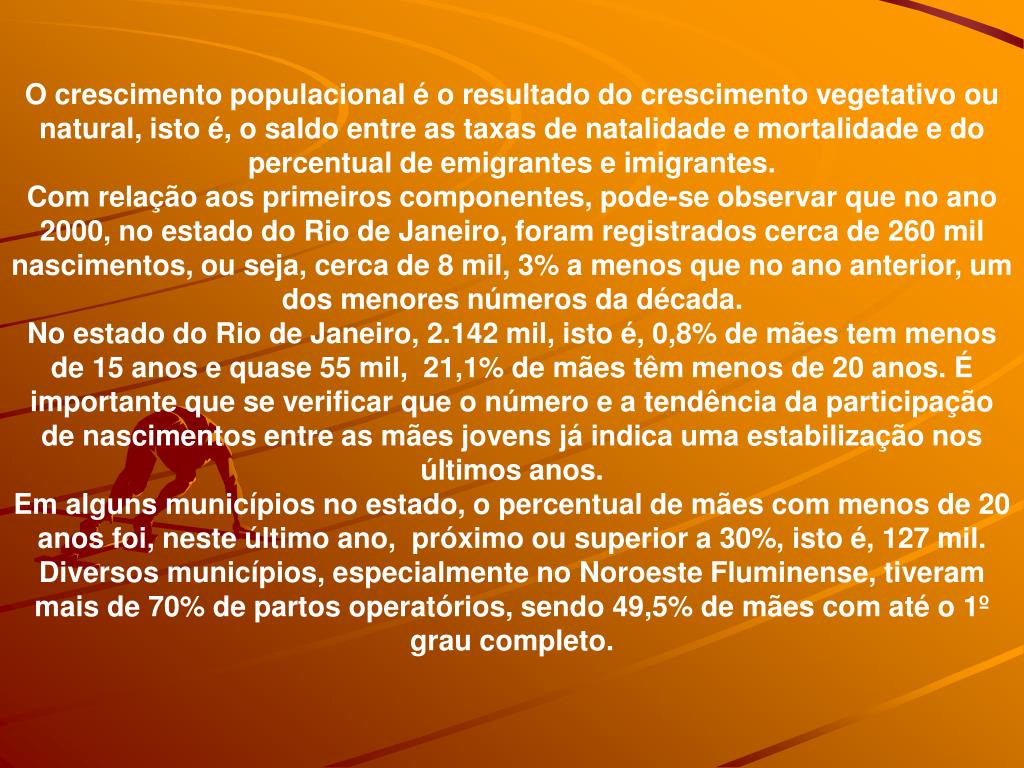 O crescimento populacional é o resultado do crescimento vegetativo ou natural, isto é, o saldo entre as taxas de natalidade e mortalidade e do percentual de emigrantes e imigrantes. Com relação aos primeiros componentes, pode-se observar que no ano 2000, no estado do Rio de Janeiro, foram registrados cerca de 260 mil nascimentos, ou seja, cerca de 8 mil, 3% a menos que no ano anterior, um dos menores números da década. No estado do Rio de Janeiro, 2.142 mil, isto é, 0,8% de mães tem menos de 15 anos e quase 55 mil, 21,1% de mães têm menos de 20 anos. É importante que se verificar que o número e a tendência da participação de nascimentos entre as mães jovens já indica uma estabilização nos últimos anos. Em alguns municípios no estado, o percentual de mães com menos de 20 anos foi, neste último ano, próximo ou superior a 30%, isto é, 127 mil. Diversos municípios, especialmente no Noroeste Fluminense, tiveram mais de 70% de partos operatórios, sendo 49,5% de mães com até o 1º grau completo.