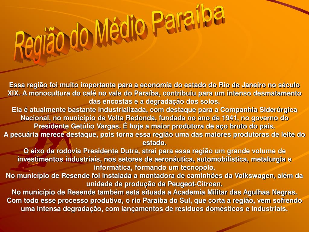 Região do Médio Paraíba Essa região foi muito importante para a economia do estado do Rio de Janeiro no século XIX. A monocultura do café no vale do Paraíba, contribuiu para um intenso desmatamento das encostas e a degradação dos solos.Ela é atualmente bastante industrializada, com destaque para a Companhia Siderúrgica Nacional, no município de Volta Redonda, fundada no ano de 1941, no governo do Presidente Getúlio Vargas. É hoje a maior produtora de aço bruto do país.A pecuária merece destaque, pois torna essa região uma das maiores produtoras de leite do estado.O eixo da rodovia Presidente Dutra, atrai para essa região um grande volume de investimentos industriais, nos setores de aeronáutica, automobilística, metalurgia e informática, formando um tecnopólo.No município de Resende foi instalada a montadora de caminhões da Volkswagen, além da unidade de produção da Peugeot-Citroen.No município de Resende também está situada a Academia Militar das Agulhas Negras.Com todo esse processo produtivo, o rio Paraíba do Sul, que corta a região, vem sofrendo uma intensa degradação, com lançamentos de resíduos domésticos e industriais.