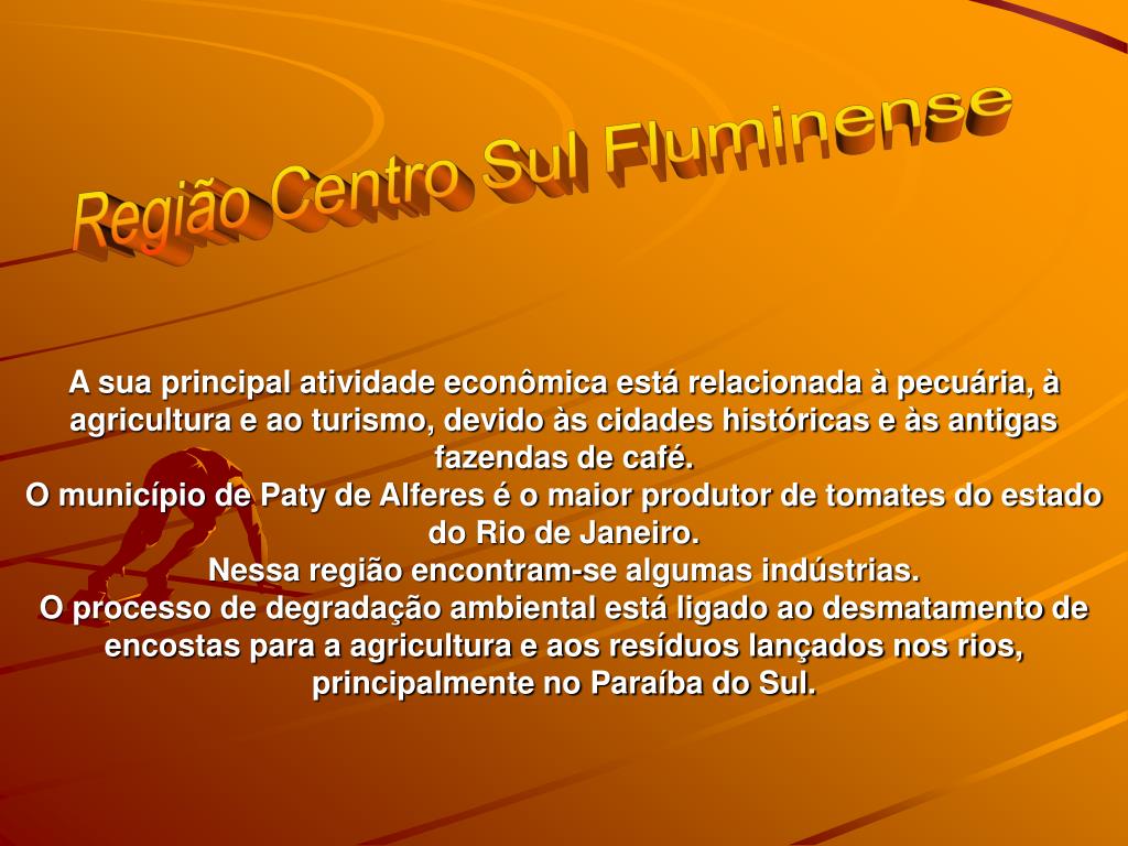 Região Centro Sul Fluminense A sua principal atividade econômica está relacionada à pecuária, à agricultura e ao turismo, devido às cidades históricas e às antigas fazendas de café.O município de Paty de Alferes é o maior produtor de tomates do estado do Rio de Janeiro.Nessa região encontram-se algumas indústrias.O processo de degradação ambiental está ligado ao desmatamento de encostas para a agricultura e aos resíduos lançados nos rios, principalmente no Paraíba do Sul.