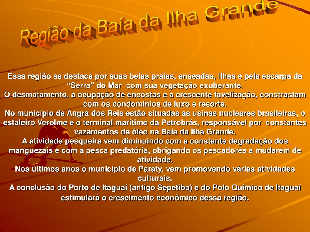 Região da Baía da Ilha Grande Essa região se destaca por suas belas praias, enseadas, ilhas e pela escarpa da “Serra” do Mar com sua vegetação exuberante. O desmatamento, a ocupação de encostas e a crescente favelização, constrastam com os condomínios de luxo e resorts.No município de Angra dos Reis estão situadas as usinas nucleares brasileiras, o estaleiro Verolme e o terminal marítimo da Petrobrás, responsável por constantes vazamentos de óleo na Baía da Ilha Grande.A atividade pesqueira vem diminuindo com a constante degradação dos manguezais e com a pesca predatória, obrigando os pescadores a mudarem de atividade.Nos últimos anos o município de Paraty, vem promovendo várias atividades culturais. A conclusão do Porto de Itaguaí (antigo Sepetiba) e do Polo Químico de Itaguaí estimulará o crescimento econômico dessa região.
