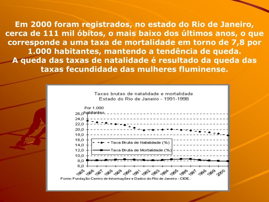 Em 2000 foram registrados, no estado do Rio de Janeiro, cerca de 111 mil óbitos, o mais baixo dos últimos anos, o que corresponde a uma taxa de mortalidade em torno de 7,8 por 1.000 habitantes, mantendo a tendência de queda. A queda das taxas de natalidade é resultado da queda das taxas fecundidade das mulheres fluminense.