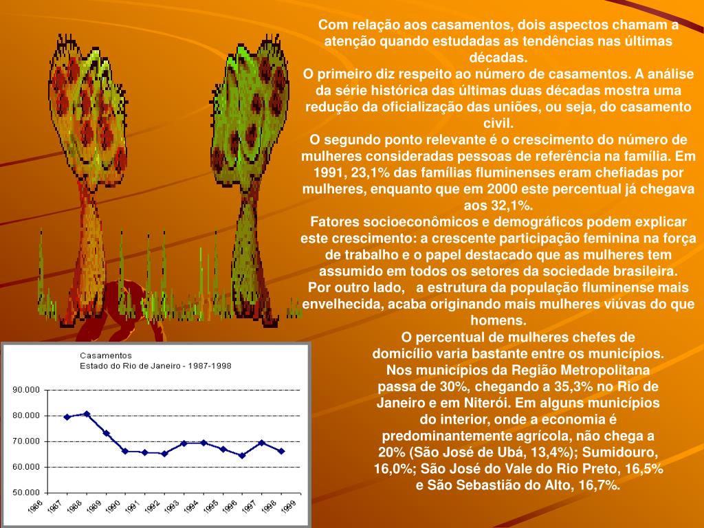 Com relação aos casamentos, dois aspectos chamam a atenção quando estudadas as tendências nas últimas décadas. O primeiro diz respeito ao número de casamentos. A análise da série histórica das últimas duas décadas mostra uma redução da oficialização das uniões, ou seja, do casamento civil. O segundo ponto relevante é o crescimento do número de mulheres consideradas pessoas de referência na família. Em 1991, 23,1% das famílias fluminenses eram chefiadas por mulheres, enquanto que em 2000 este percentual já chegava aos 32,1%. Fatores socioeconômicos e demográficos podem explicar este crescimento: a crescente participação feminina na força de trabalho e o papel destacado que as mulheres tem assumido em todos os setores da sociedade brasileira. Por outro lado, a estrutura da população fluminense mais envelhecida, acaba originando mais mulheres viúvas do que homens. O percentual de mulheres chefes de domicílio varia bastante entre os municípios. Nos municípios da Região Metropolitana passa de 30%, chegando a 35,3% no Rio de Janeiro e em Niterói. Em alguns municípios do interior, onde a economia é predominantemente agrícola, não chega a 20% (São José de Ubá, 13,4%); Sumidouro, 16,0%; São José do Vale do Rio Preto, 16,5% e São Sebastião do Alto, 16,7%.