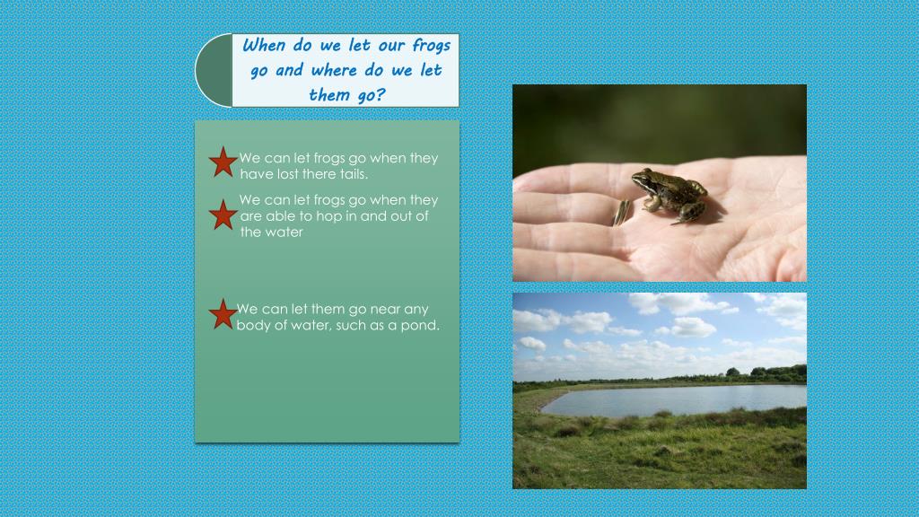 We can let frogs go when they have lost there tails. We can let frogs go when they are able to hop in and out of the water We can let them go near any body of water, such as a pond.