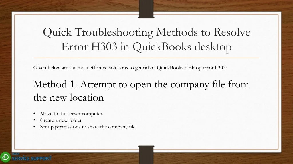 Quick Troubleshooting Methods to Resolve Error H303 in QuickBooks desktop • Given below are the most effective solutions to get rid of QuickBooks desktop error h303: • Method 1. Attempt to open the company file from the new location • Move to the server computer. • Create a new folder. • Set up permissions to share the company file.