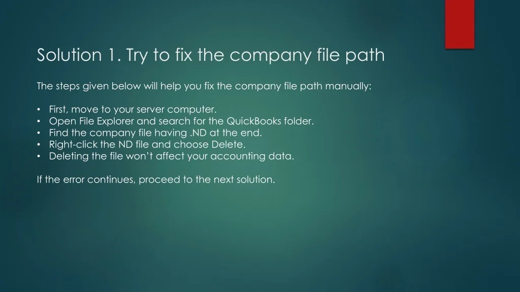 Solution 1. Try to fix the company file path • The steps given below will help you fix the company file path manually: • First, move to your server computer. • Open File Explorer and search for the QuickBooks folder. • Find the company file having .ND at the end. • Right-click the ND file and choose Delete. • Deleting the file won’t affect your accounting data. • If the error continues, proceed to the next solution.