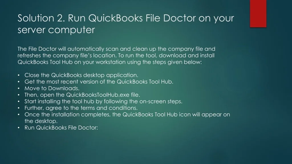 Solution 2. Run QuickBooks File Doctor on your server computer • The File Doctor will automatically scan and clean up the company file and refreshes the company file’s location. To run the tool, download and install QuickBooks Tool Hub on your workstation using the steps given below: • Close the QuickBooks desktop application. • Get the most recent version of the QuickBooks Tool Hub. • Move to Downloads. • Then, open the QuickBooksToolHub.exe file. • Start installing the tool hub by following the on-screen steps. • Further, agree to the terms and conditions. • Once the installation completes, the QuickBooks Tool Hub icon will appear on the desktop. • Run QuickBooks File Doctor: