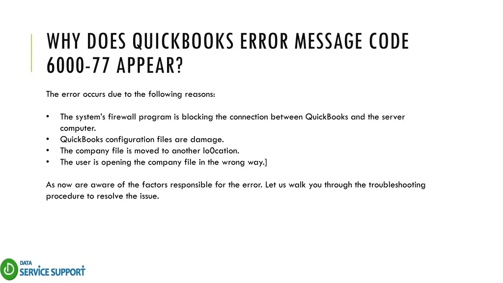 Why does QuickBooks error message code 6000-77 appear? • The error occurs due to the following reasons: • The system’s firewall program is blocking the connection between QuickBooks and the server computer. • QuickBooks configuration files are damage. • The company file is moved to another lo0cation. • The user is opening the company file in the wrong way.] • As now are aware of the factors responsible for the error. Let us walk you through the troubleshooting procedure to resolve the issue.