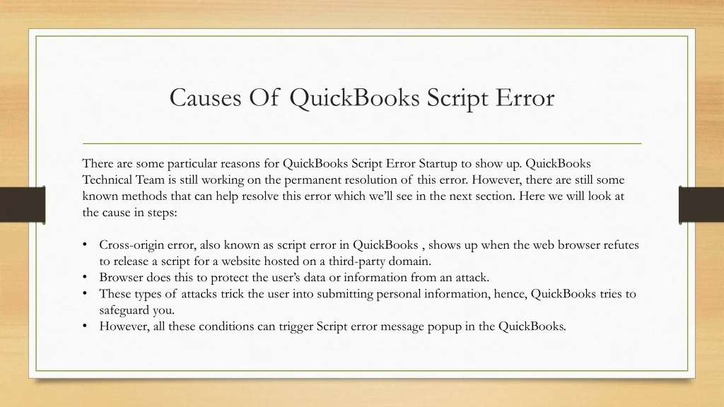 Causes Of QuickBooks Script Error • There are some particular reasons for QuickBooks Script Error Startup to show up. QuickBooks Technical Team is still working on the permanent resolution of this error. However, there are still some known methods that can help resolve this error which we’ll see in the next section. Here we will look at the cause in steps: • Cross-origin error, also known as script error in QuickBooks , shows up when the web browser refutes to release a script for a website hosted on a third-party domain. • Browser does this to protect the user’s data or information from an attack. • These types of attacks trick the user into submitting personal information, hence, QuickBooks tries to safeguard you. • However, all these conditions can trigger Script error message popup in the QuickBooks.