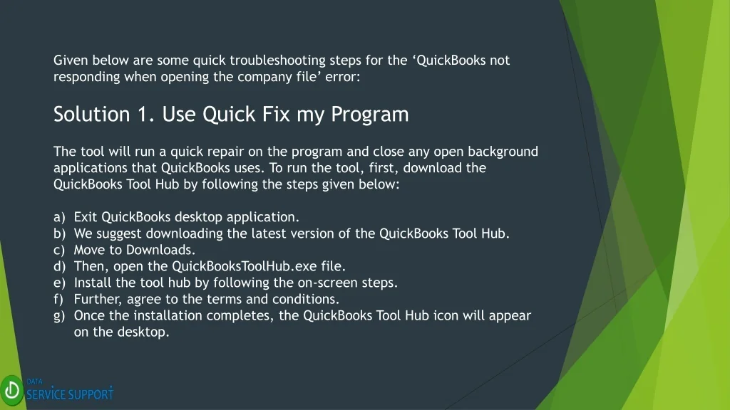 Given below are some quick troubleshooting steps for the ‘QuickBooks not responding when opening the company file’ error: Solution 1. Use Quick Fix my Program The tool will run a quick repair on the program and close any open background applications that QuickBooks uses. To run the tool, first, download the QuickBooks Tool Hub by following the steps given below: Exit QuickBooks desktop application. We suggest downloading the latest version of the QuickBooks Tool Hub. Move to Downloads. Then, open the QuickBooksToolHub.exe file. Install the tool hub by following the on-screen steps. Further, agree to the terms and conditions. Once the installation completes, the QuickBooks Tool Hub icon will appear on the desktop.