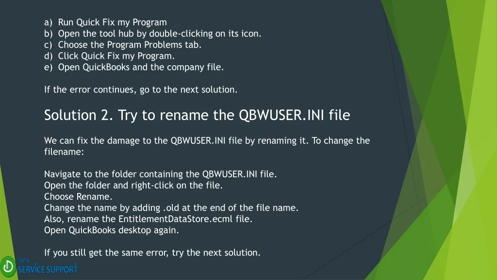 Run Quick Fix my Program Open the tool hub by double-clicking on its icon. Choose the Program Problems tab. Click Quick Fix my Program. Open QuickBooks and the company file. If the error continues, go to the next solution. Solution 2. Try to rename the QBWUSER.INI file We can fix the damage to the QBWUSER.INI file by renaming it. To change the filename: Navigate to the folder containing the QBWUSER.INI file. Open the folder and right-click on the file. Choose Rename. Change the name by adding .old at the end of the file name. Also, rename the EntitlementDataStore.ecml file. Open QuickBooks desktop again. If you still get the same error, try the next solution.