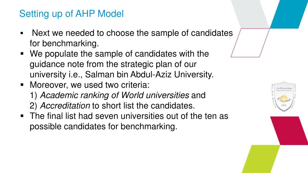 Setting up of AHP Model • Next we needed to choose the sample of candidates for benchmarking. • We populate the sample of candidates with the guidance note from the strategic plan of our university i.e., Salman bin Abdul-Aziz University. • Moreover, we used two criteria: • 1) Academic ranking of World universities and • 2) Accreditation to short list the candidates. • The final list had seven universities out of the ten as possible candidates for benchmarking.