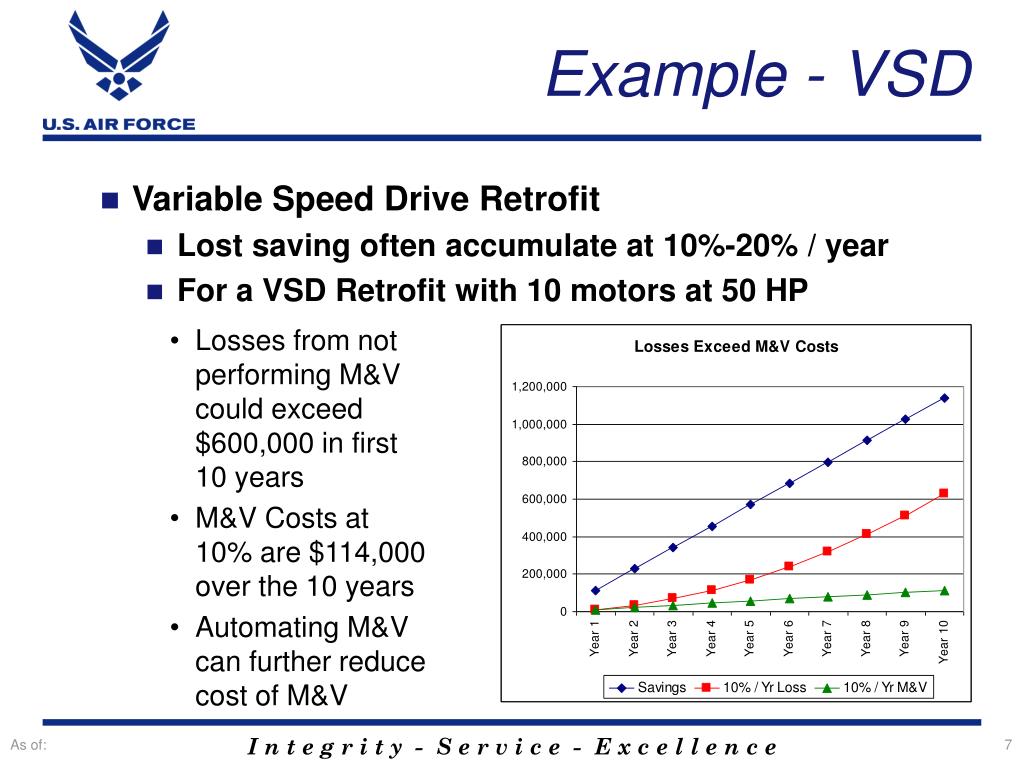 Example - VSD • Variable Speed Drive Retrofit • Lost saving often accumulate at 10%-20% / year • For a VSD Retrofit with 10 motors at 50 HP • Losses from not performing M&V could exceed $600,000 in first 10 years • M&V Costs at 10% are $114,000 over the 10 years • Automating M&V can further reduce cost of M&V