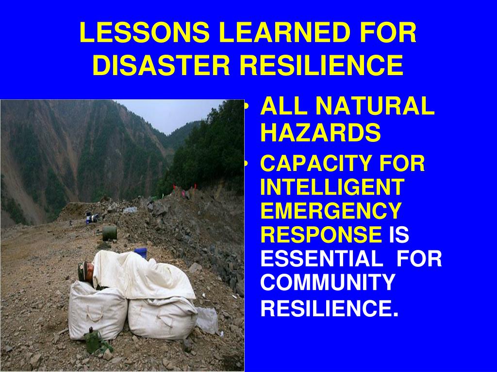 LESSONS LEARNED FOR DISASTER RESILIENCE • ALL NATURAL HAZARDS • CAPACITY FOR INTELLIGENT EMERGENCY RESPONSE IS ESSENTIAL FOR COMMUNITY RESILIENCE.