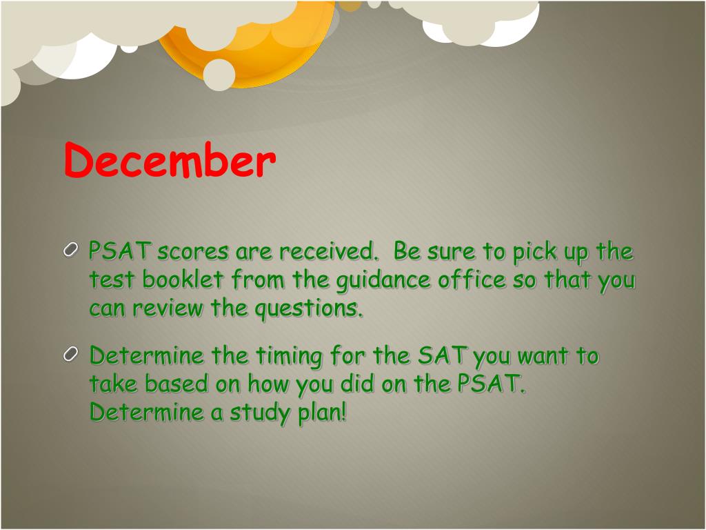December • PSAT scores are received. Be sure to pick up the test booklet from the guidance office so that you can review the questions. • Determine the timing for the SAT you want to take based on how you did on the PSAT. Determine a study plan!