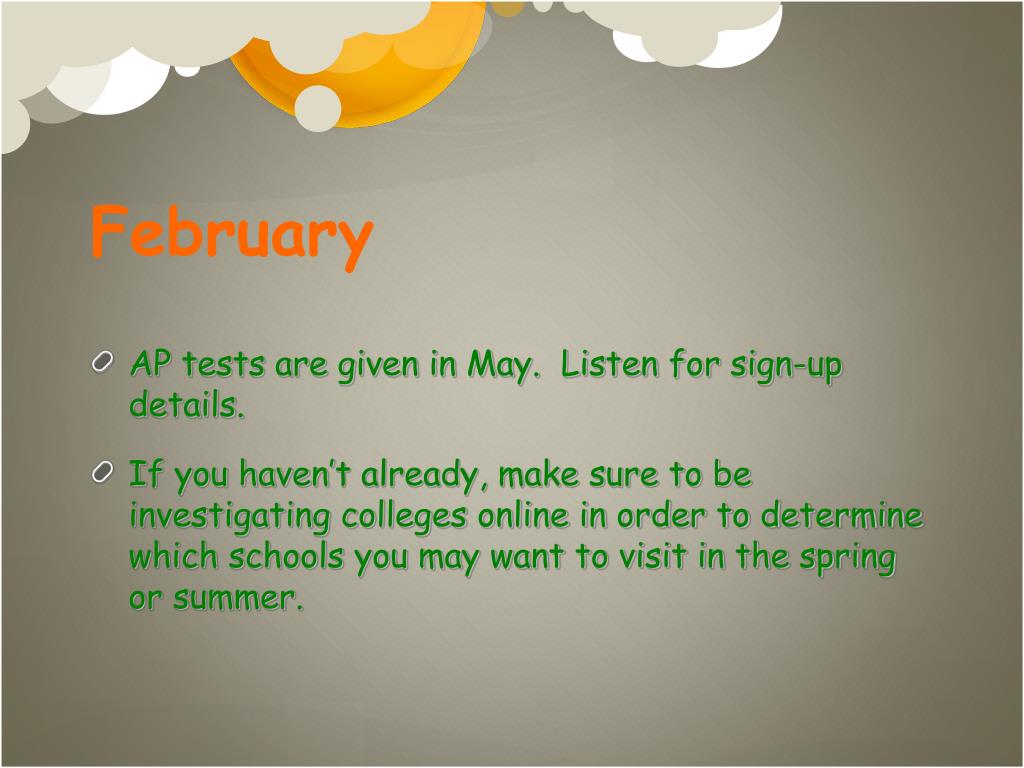 February • AP tests are given in May. Listen for sign-up details. • If you haven’t already, make sure to be investigating colleges online in order to determine which schools you may want to visit in the spring or summer.