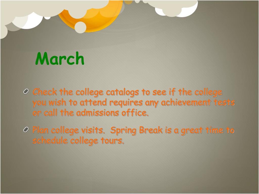 March • Check the college catalogs to see if the college you wish to attend requires any achievement tests or call the admissions office. • Plan college visits. Spring Break is a great time to schedule college tours.