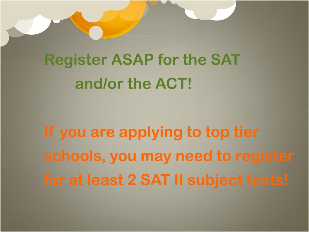 Register ASAP for the SAT and/or the ACT!If you are applying to top tier schools, you may need to register for at least 2 SAT II subject tests! June 12, 2010