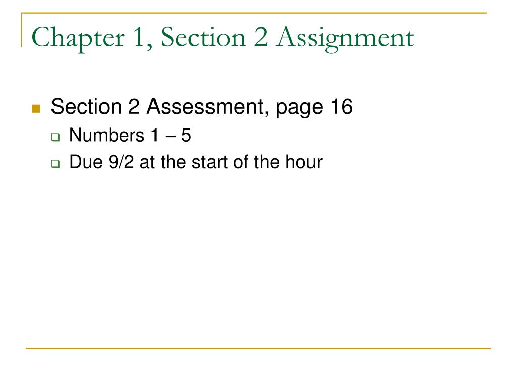 Chapter 1, Section 2 Assignment • Section 2 Assessment, page 16 • Numbers 1 – 5 • Due 9/2 at the start of the hour