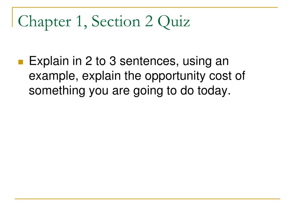 Chapter 1, Section 2 Quiz • Explain in 2 to 3 sentences, using an example, explain the opportunity cost of something you are going to do today.