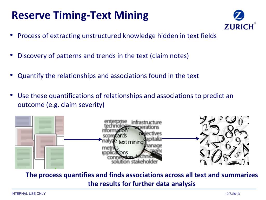 Reserve Timing-Text Mining The process quantifies and finds associations across all text and summarizes the results for further data analysis • Process of extracting unstructured knowledge hidden in text fields • Discovery of patterns and trends in the text (claim notes) • Quantify the relationships and associations found in the text • Use these quantifications of relationships and associations to predict an outcome (e.g. claim severity) 12/5/2013