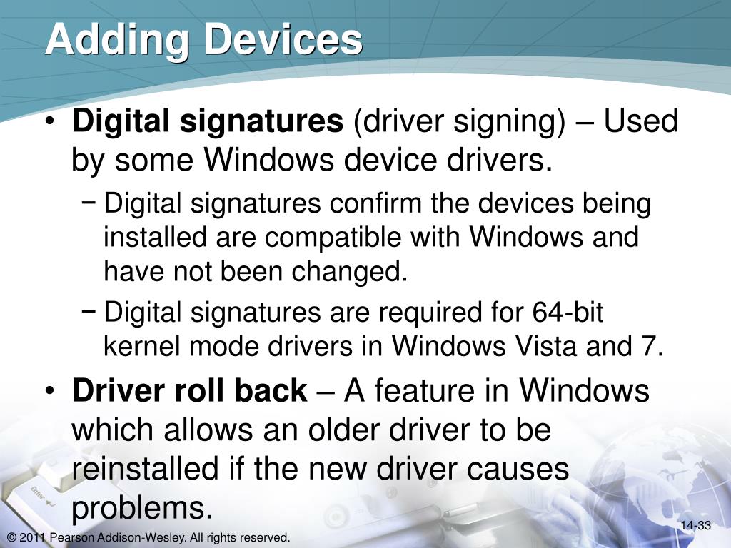 Adding Devices • Digital signatures (driver signing) – Used by some Windows device drivers. • Digital signatures confirm the devices being installed are compatible with Windows and have not been changed. • Digital signatures are required for 64-bit kernel mode drivers in Windows Vista and 7. • Driver roll back – A feature in Windows which allows an older driver to be reinstalled if the new driver causes problems.