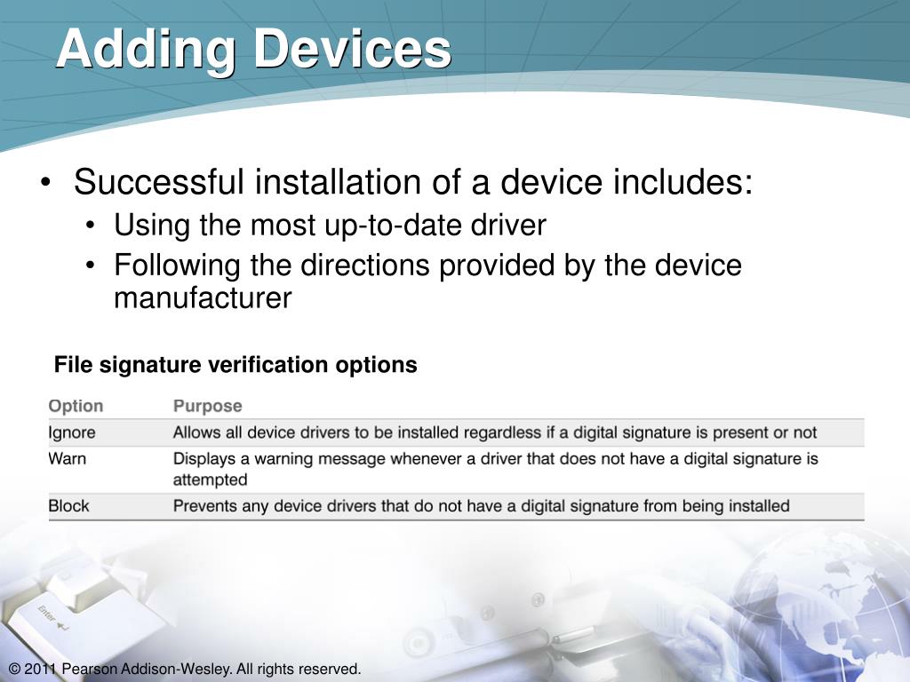 Adding Devices • Successful installation of a device includes: • Using the most up-to-date driver • Following the directions provided by the device manufacturer File signature verification options