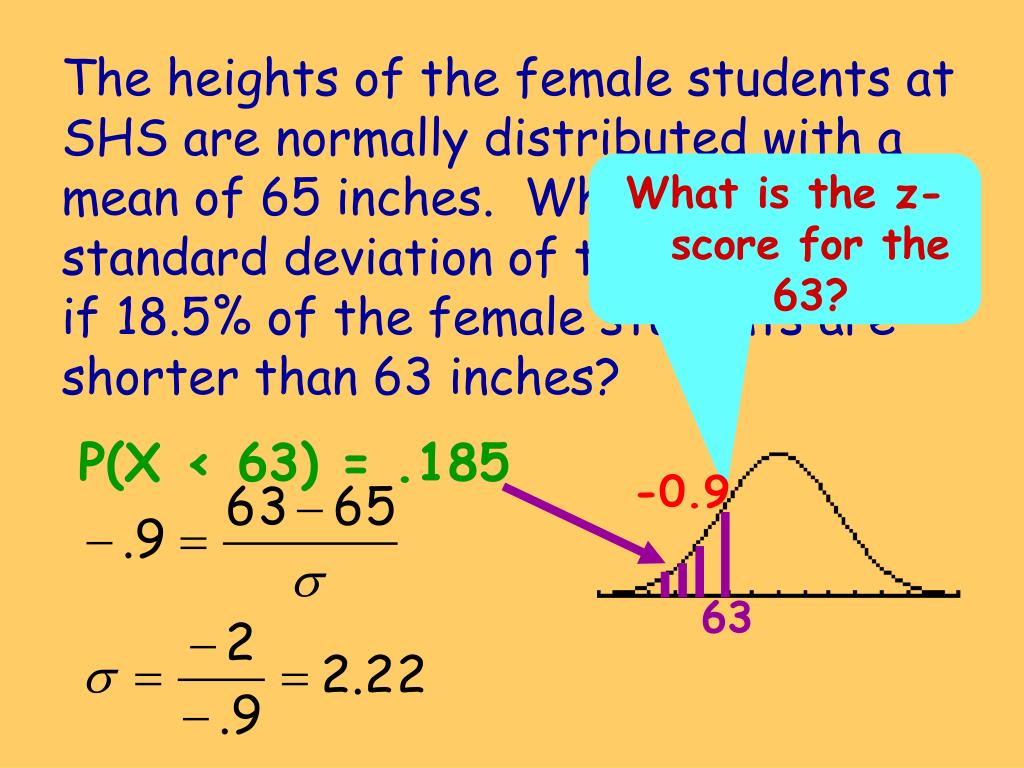 The heights of the female students at SHS are normally distributed with a mean of 65 inches. What is the standard deviation of this distribution if 18.5% of the female students are shorter than 63 inches? What is the z-score for the 63? P(X < 63) = .185 -0.9 63