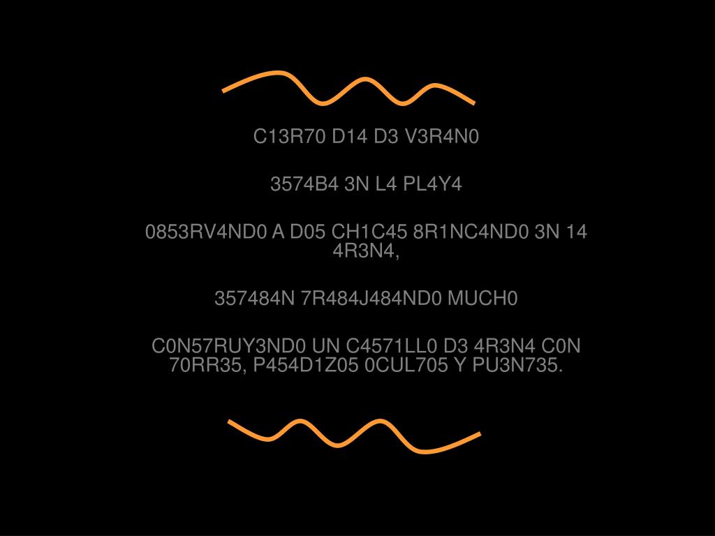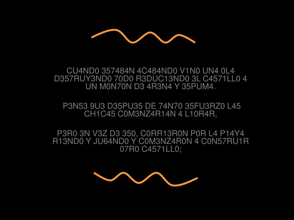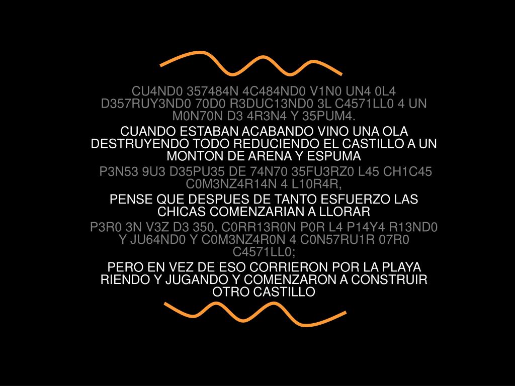 CU4ND0 357484N 4C484ND0 V1N0 UN4 0L4 D357RUY3ND0 70D0 R3DUC13ND0 3L C4571LL0 4 UN M0N70N D3 4R3N4 Y 35PUM4. • CUANDO ESTABAN ACABANDO VINO UNA OLA DESTRUYENDO TODO REDUCIENDO EL CASTILLO A UN MONTON DE ARENA Y ESPUMA • P3N53 9U3 D35PU35 DE 74N70 35FU3RZ0 L45 CH1C45 C0M3NZ4R14N 4 L10R4R, • PENSE QUE DESPUES DE TANTO ESFUERZO LAS CHICAS COMENZARIAN A LLORAR • P3R0 3N V3Z D3 350, C0RR13R0N P0R L4 P14Y4 R13ND0 Y JU64ND0 Y C0M3NZ4R0N 4 C0N57RU1R 07R0 C4571LL0; • PERO EN VEZ DE ESO CORRIERON POR LA PLAYA RIENDO Y JUGANDO Y COMENZARON A CONSTRUIR OTRO CASTILLO