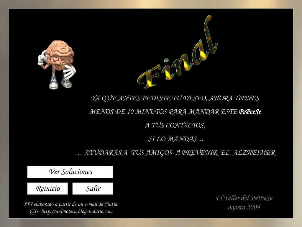 Final YA QUE ANTES PEDISTE TU DESEO, AHORA TIENES MENOS DE 10 MINUTOS PARA MANDAR ESTE PePeeSe A TUS CONTACTOS, SI LO MANDAS ... … AYUDARÁS A TUS AMIGOS A PREVENIR EL ALZHEIMER Ver Soluciones Reinicio Salir El Taller del PePeeSe agosto 2009 PPS elaborado a partir de un e-mail de Cíntia Gifs -http://animoteca.blogcindario.com