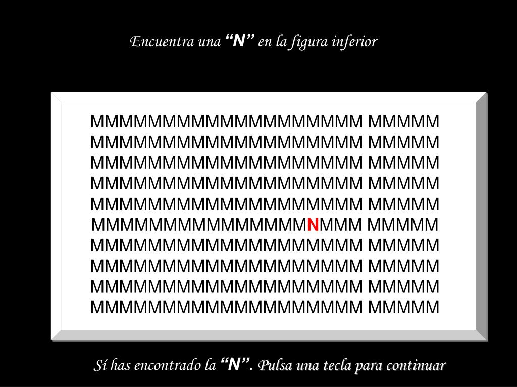 Encuentra una “N” en la figura inferior • MMMMMMMMMMMMMMMMMMM MMMMM • MMMMMMMMMMMMMMMMMMM MMMMM • MMMMMMMMMMMMMMMMMMM MMMMM • MMMMMMMMMMMMMMMMMMM MMMMM • MMMMMMMMMMMMMMMMMMM MMMMM • MMMMMMMMMMMMMMMNMMM MMMMM • MMMMMMMMMMMMMMMMMMM MMMMM • MMMMMMMMMMMMMMMMMMM MMMMM • MMMMMMMMMMMMMMMMMMM MMMMM • MMMMMMMMMMMMMMMMMMM MMMMM Sí has encontrado la “N”.Pulsa una tecla para continuar