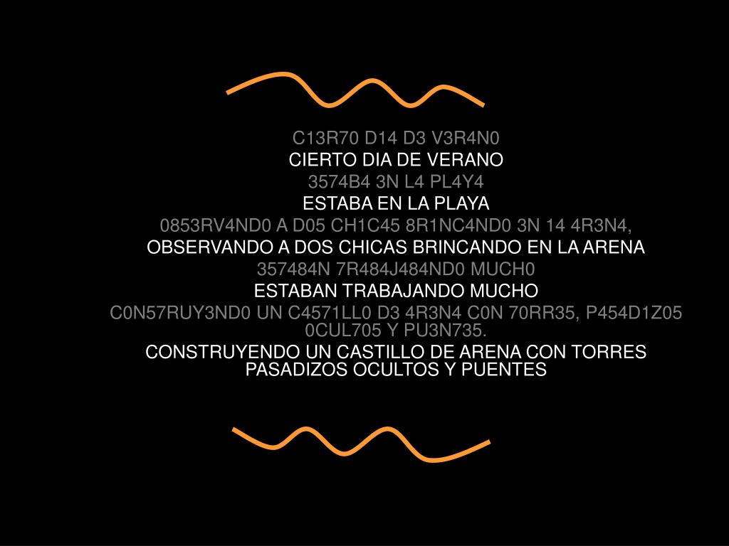 C13R70 D14 D3 V3R4N0 • CIERTO DIA DE VERANO • 3574B4 3N L4 PL4Y4 • ESTABA EN LA PLAYA • 0853RV4ND0 A D05 CH1C45 8R1NC4ND0 3N 14 4R3N4, • OBSERVANDO A DOS CHICAS BRINCANDO EN LA ARENA • 357484N 7R484J484ND0 MUCH0 • ESTABAN TRABAJANDO MUCHO • C0N57RUY3ND0 UN C4571LL0 D3 4R3N4 C0N 70RR35, P454D1Z05 0CUL705 Y PU3N735. • CONSTRUYENDO UN CASTILLO DE ARENA CON TORRES PASADIZOS OCULTOS Y PUENTES