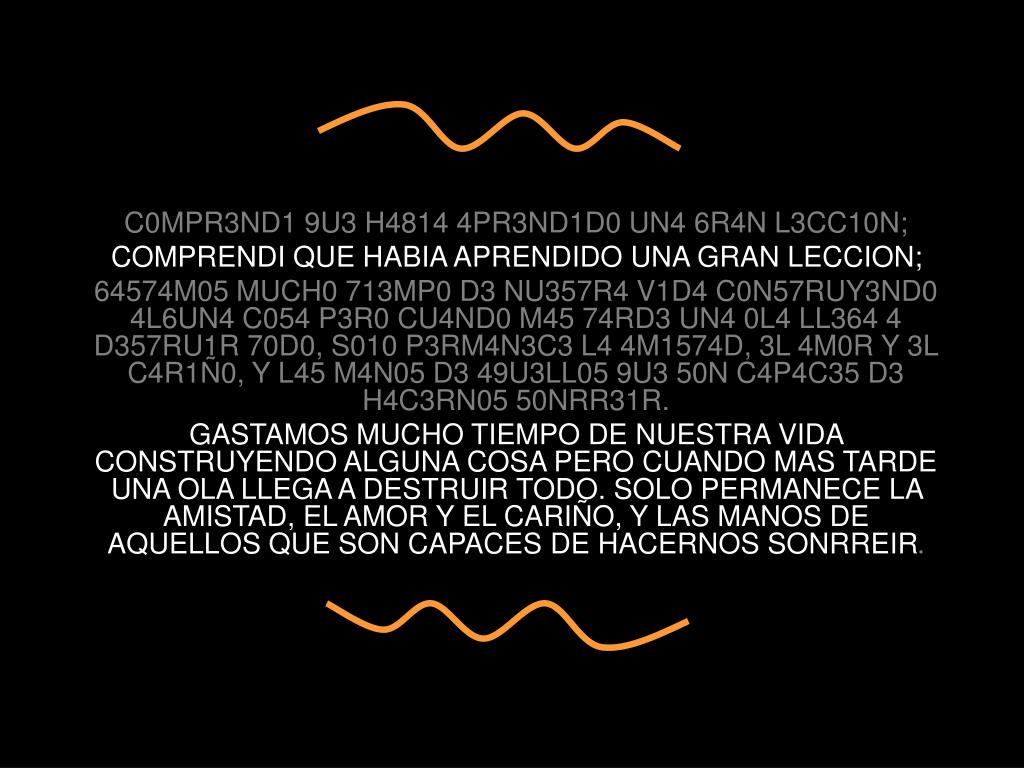 C0MPR3ND1 9U3 H4814 4PR3ND1D0 UN4 6R4N L3CC10N; • COMPRENDI QUE HABIA APRENDIDO UNA GRAN LECCION; • 64574M05 MUCH0 713MP0 D3 NU357R4 V1D4 C0N57RUY3ND0 4L6UN4 C054 P3R0 CU4ND0 M45 74RD3 UN4 0L4 LL364 4 D357RU1R 70D0, S010 P3RM4N3C3 L4 4M1574D, 3L 4M0R Y 3L C4R1Ñ0, Y L45 M4N05 D3 49U3LL05 9U3 50N C4P4C35 D3 H4C3RN05 50NRR31R. • GASTAMOS MUCHO TIEMPO DE NUESTRA VIDA CONSTRUYENDO ALGUNA COSA PERO CUANDO MAS TARDE UNA OLA LLEGA A DESTRUIR TODO. SOLO PERMANECE LA AMISTAD, EL AMOR Y EL CARIÑO, Y LAS MANOS DE AQUELLOS QUE SON CAPACES DE HACERNOS SONRREIR.