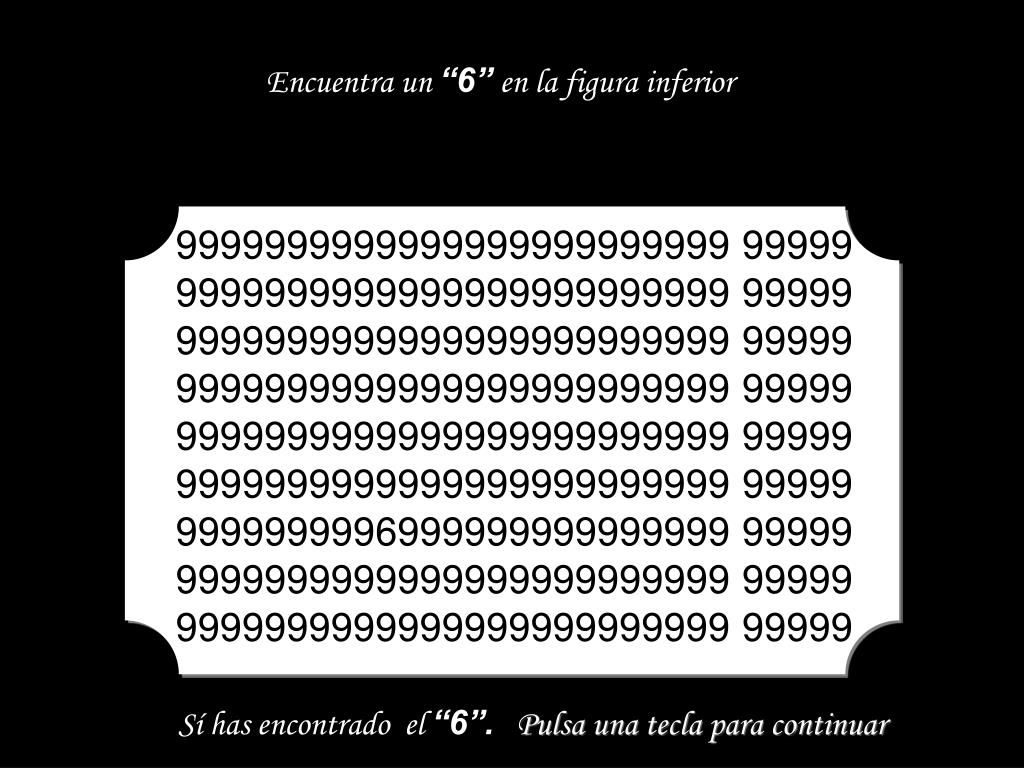 Encuentra un “6” en la figura inferior • 9999999999999999999999999 99999 9999999999999999999999999 99999 • 9999999999999999999999999 99999 9999999999999999999999999 99999 • 9999999999999999999999999 99999 9999999999999999999999999 99999 • 9999999996999999999999999 99999 9999999999999999999999999 99999 • 9999999999999999999999999 99999 Sí has encontrado el “6”.Pulsa una tecla para continuar