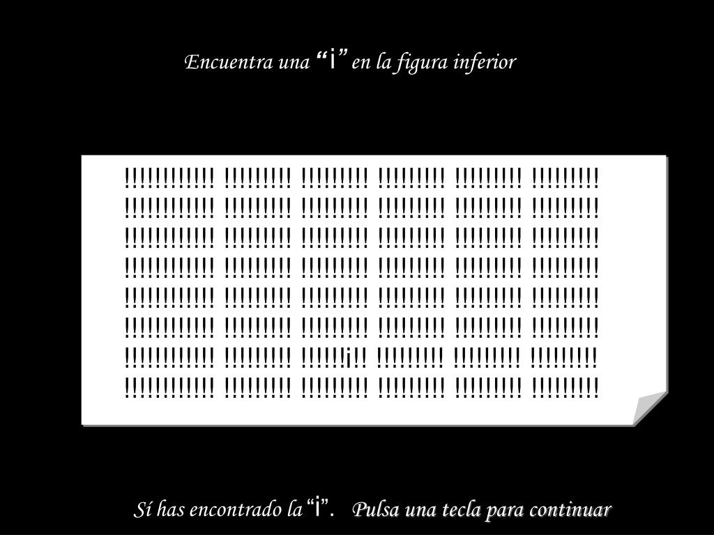 Encuentra una “ii” en la figura inferior • !!!!!!!!!!!! !!!!!!!!! !!!!!!!!! !!!!!!!!! !!!!!!!!! !!!!!!!!! • !!!!!!!!!!!! !!!!!!!!! !!!!!!!!! !!!!!!!!! !!!!!!!!! !!!!!!!!! • !!!!!!!!!!!! !!!!!!!!! !!!!!!!!! !!!!!!!!! !!!!!!!!! !!!!!!!!! • !!!!!!!!!!!! !!!!!!!!! !!!!!!!!! !!!!!!!!! !!!!!!!!! !!!!!!!!! • !!!!!!!!!!!! !!!!!!!!! !!!!!!!!! !!!!!!!!! !!!!!!!!! !!!!!!!!! • !!!!!!!!!!!! !!!!!!!!! !!!!!!!!! !!!!!!!!! !!!!!!!!! !!!!!!!!! • !!!!!!!!!!!! !!!!!!!!! !!!!!!i!! !!!!!!!!! !!!!!!!!! !!!!!!!!! • !!!!!!!!!!!! !!!!!!!!! !!!!!!!!! !!!!!!!!! !!!!!!!!! !!!!!!!!! Sí has encontrado la “i”.Pulsa una tecla para continuar