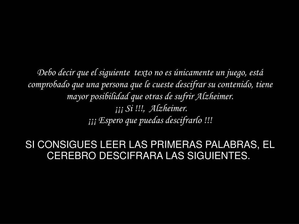 Debo decir que el siguiente texto no es únicamente un juego, está comprobado que una persona que le cueste descifrar su contenido, tiene mayor posibilidad que otras de sufrir Alzheimer. ¡¡¡ Si !!!, Alzheimer.¡¡¡ Espero que puedas descifrarlo !!!SI CONSIGUES LEER LAS PRIMERAS PALABRAS, EL CEREBRO DESCIFRARA LAS SIGUIENTES.