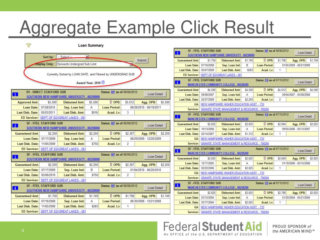 Checking Aggregates • Aggregates are calculated in real-time when you retrieve a student on the NSLDS Professional Access Site (NSLDSFAP) • May be different from the last ISIR or last time student/borrower data was retrieved • Aggregate loan information is separated into undergraduate and graduate loan totals • The undergraduate aggregate section will display only if the student has undergraduate loans and the graduate aggregate section will display only if the student has graduate loans