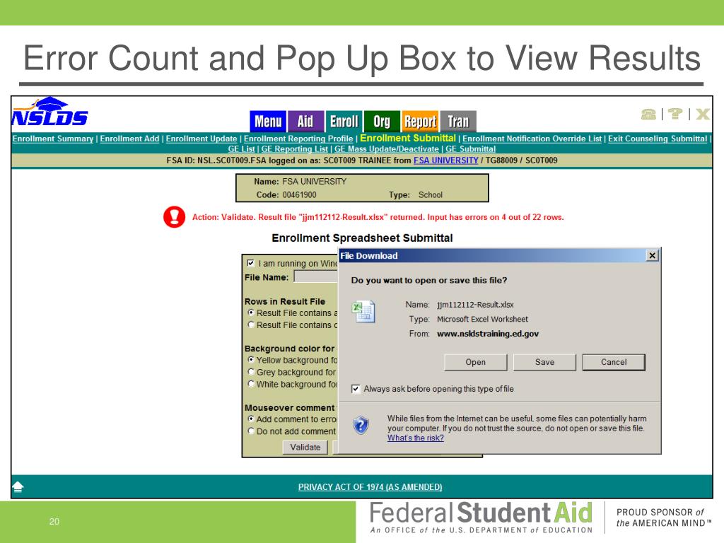 Enrollment Spreadsheet Submittal • The Enrollment Spreadsheet Submittal Format, will be posted in early December 2012 to the "Software and Associated Documents" section of the Federal Student Aid Download (FSAdownload) Web site • It will include: • Enrollment Spreadsheet Submittal Instructions Guide • Enrollment Spreadsheet Submittal Format • There is also information in the NSLDS Enrollment Reporting Guide posted on IFAP November 20, 2012