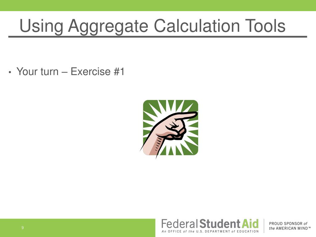 Using Aggregate Calculation Tools • Your turn – Exercise #1