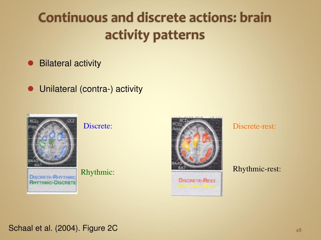 Continuous and discrete actions: brain activity patterns • Bilateral activity • Unilateral (contra-) activity Discrete: Discrete-rest: Rhythmic-rest: Rhythmic: Schaal et al. (2004). Figure 2C