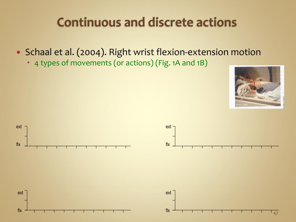 Continuous and discrete actions Schaal et al. (2004). Right wrist flexion-extension motion 4 types of movements (or actions) (Fig. 1A and 1B) ext flx ext flx ext flx ext flx