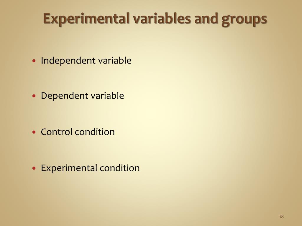 Experimental variables and groups Independent variable Dependent variable Control condition Experimental condition