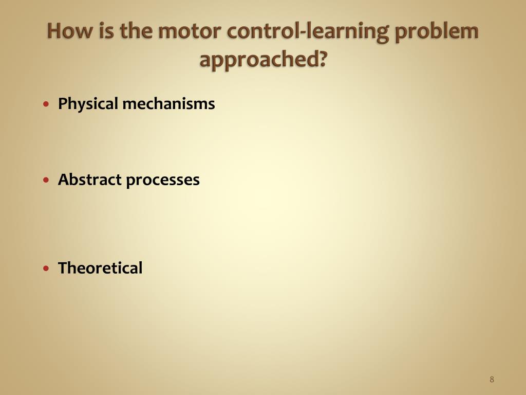 How is the motor control-learning problem approached? • Physical mechanisms • Abstract processes • Theoretical