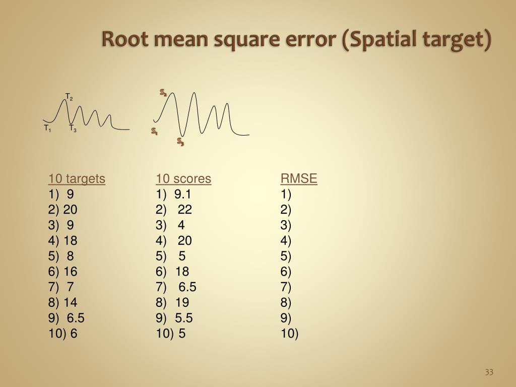Root mean square error (Spatial target) 10 targets 1) 9 2) 20 3) 9 4) 18 5) 8 6) 16 7) 7 8) 14 9) 6.5 10) 6 10 scores 1) 9.1 2) 22 3) 4 4) 20 5 18 6.5 19 5.5 5 RMSE 1) 2) 3) 4) 5) 6) 7) 8) 9) 10) S2 T2 T1 T3 S1 S3