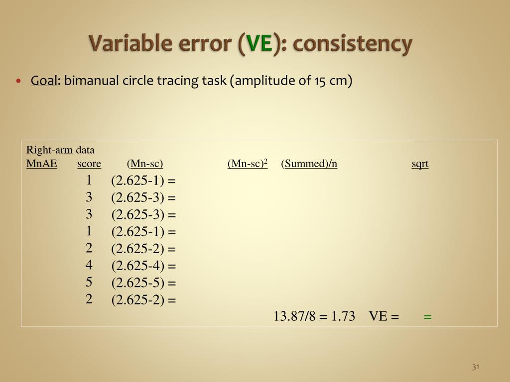 Variable error (VE): consistency Goal: bimanual circle tracing task (amplitude of 15 cm) Right-arm data MnAEscore (Mn-sc)(Mn-sc)2(Summed)/nsqrt 1 3 3 1 2 4 5 2 (2.625-1) = (2.625-3) = (2.625-3) = (2.625-1) = (2.625-2) = (2.625-4) = (2.625-5) = (2.625-2) = 13.87/8 = 1.73 VE = =