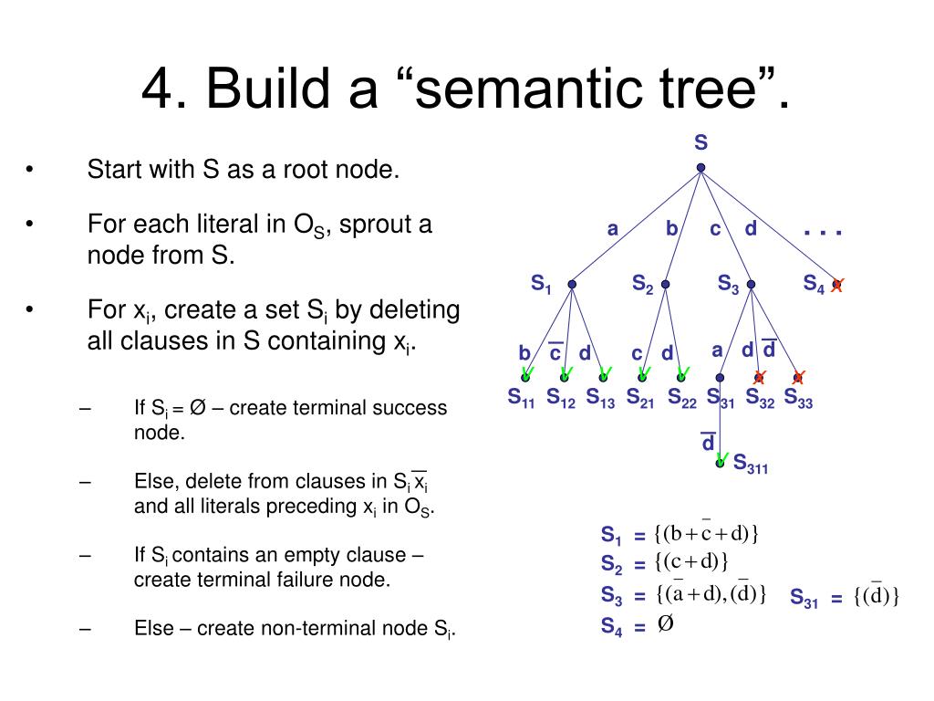 S . . . a b c d S1 • If Si = Ø – create terminal success node. • Else, delete from clauses in Si xi and all literals preceding xi in OS. • If Si contains an empty clause – create terminal failure node. • Else – create non-terminal node Si. S = 4. Build a “semantic tree”. • Start with S as a root node. • For each literal in OS, sprout a node from S. • For xi, create a set Si by deleting all clauses in S containing xi. S1 =