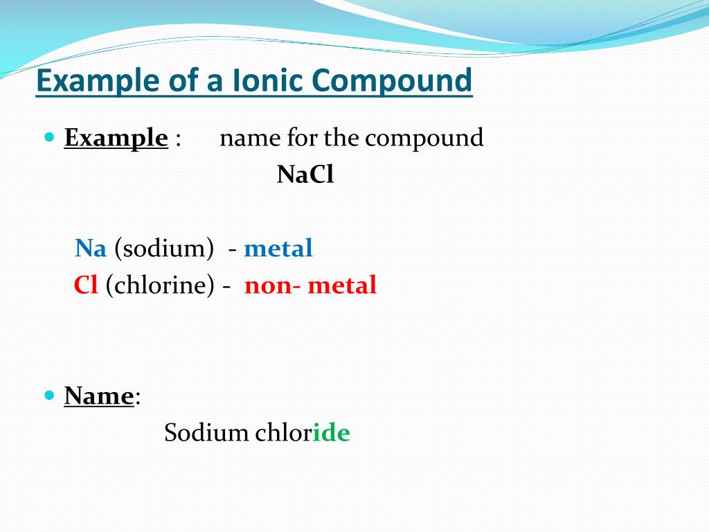 Example of a Ionic Compound • Example : name for the compound NaCl Na(sodium) - metal Cl(chlorine) - non- metal • Name: Sodium chloride