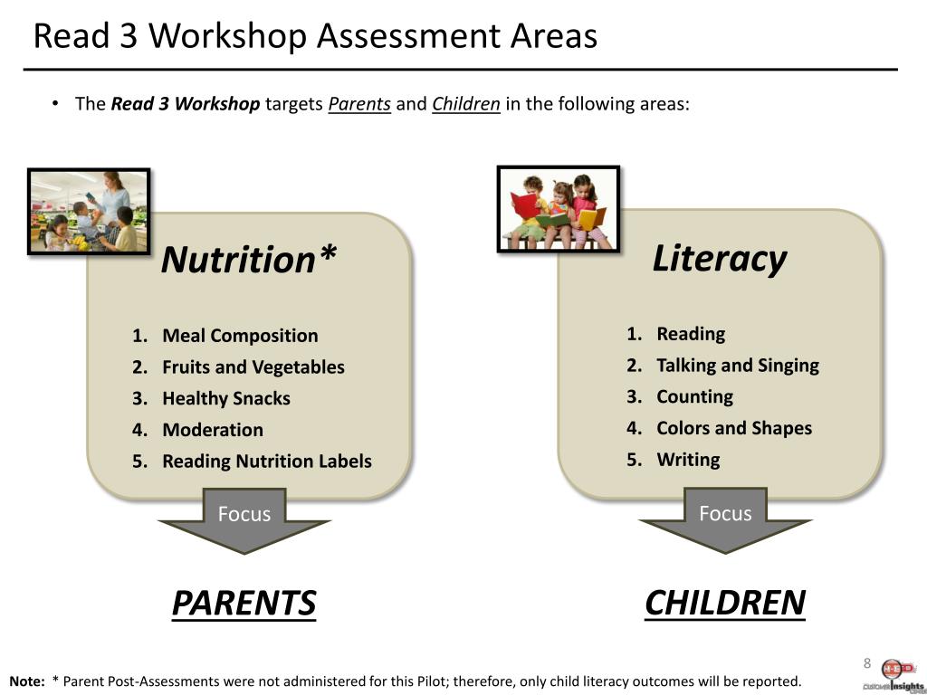 Read 3 Workshop Assessment Areas Focus Focus CHILDREN PARENTS • The Read 3 Workshop targets Parents and Children in the following areas: Note: * Parent Post-Assessments were not administered for this Pilot; therefore, only child literacy outcomes will be reported.