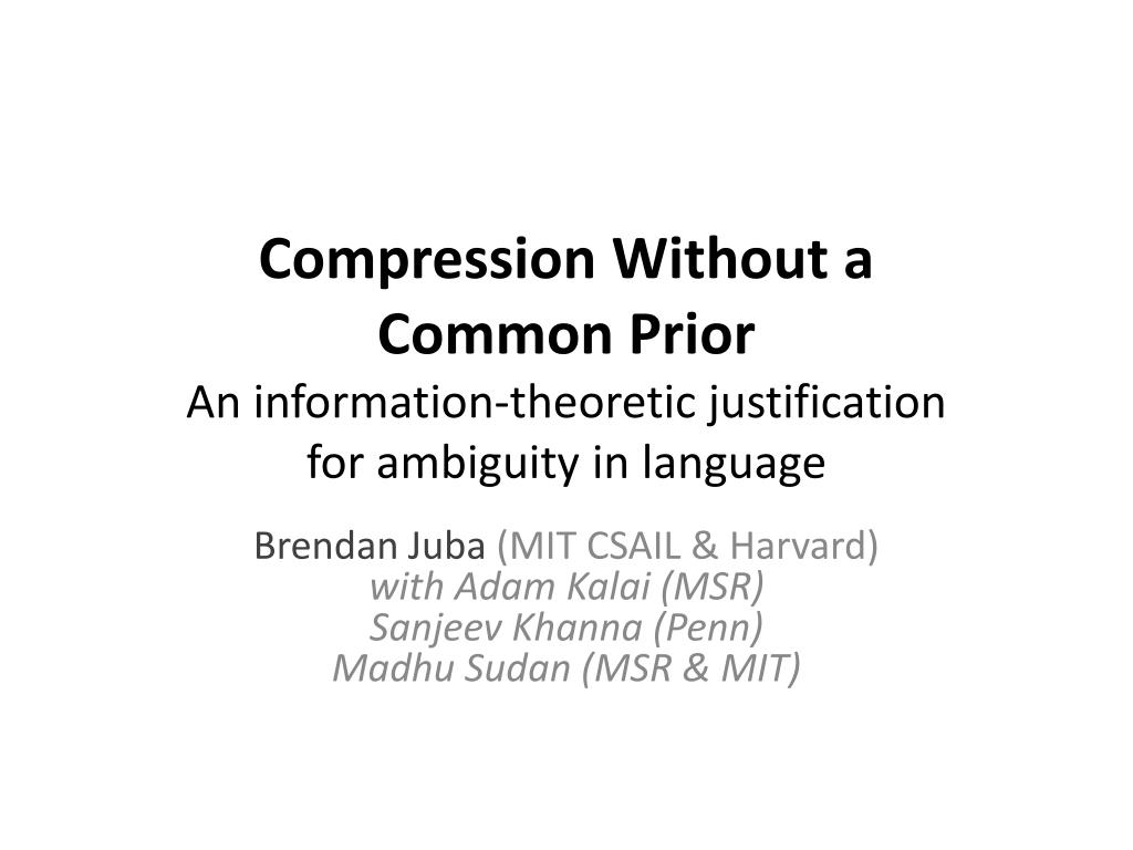 Compression Without a Common PriorAn information-theoretic justification for ambiguity in language Brendan Juba (MIT CSAIL & Harvard)with Adam Kalai (MSR)SanjeevKhanna (Penn)Madhu Sudan (MSR & MIT)