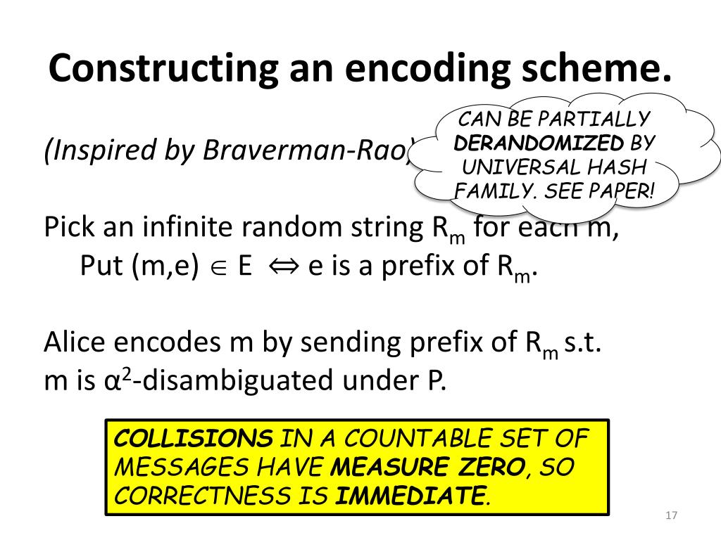 Constructing an encoding scheme. CAN BE PARTIALLY DERANDOMIZED BY UNIVERSAL HASH FAMILY. SEE PAPER! (Inspired by Braverman-Rao)Pick an infinite random string Rm for each m, Put (m,e) E ⇔ e is a prefix of Rm.Alice encodes m by sendingprefix of Rms.t.m isα2-disambiguated under P. COLLISIONS IN A COUNTABLE SET OF MESSAGES HAVE MEASURE ZERO, SO CORRECTNESS IS IMMEDIATE.