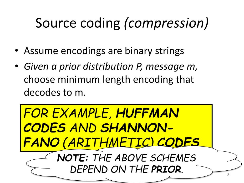 Source coding (compression) • Assume encodings are binary strings • Given a prior distribution P, message m,choose minimum length encoding that decodes to m. FOR EXAMPLE, HUFFMAN CODES AND SHANNON-FANO (ARITHMETIC) CODES NOTE: THE ABOVE SCHEMES DEPEND ON THE PRIOR.